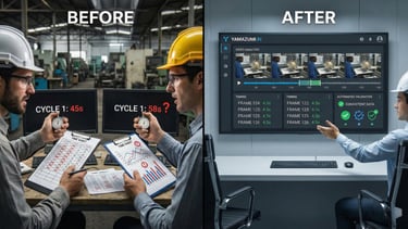 No necesitas describir tareas ni documentar cada elemento manualmente. Yamazumi AI identifica automáticamente actividades, tiempos de ciclo, secuencia real de trabajo, tiempos muertos y cuellos de botella. Todo frame por frame.