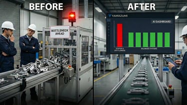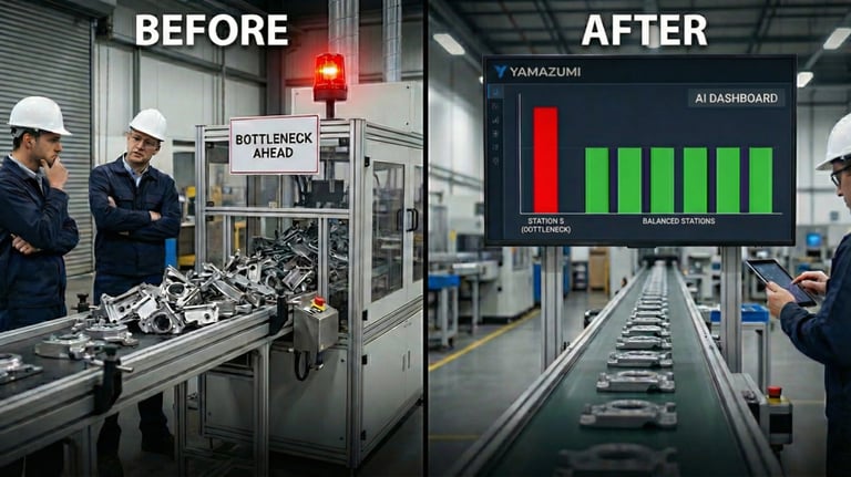 Yamazumi AI identifica cuellos de botella reales y desbalances automáticamente.
