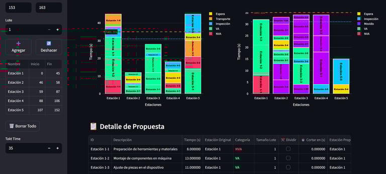 Solo indica en qué segundo inicia y termina cada estación, y el Takt Time con el que deseas balancear tu línea. El sistema ajusta automáticamente todo el modelo a tu objetivo de producción.